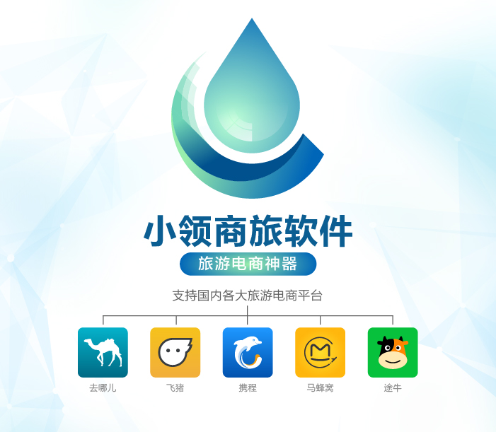 小領(lǐng)商旅軟件,旅游電商神器,國內(nèi)各大旅游電商平臺(去哪兒,攜程,途牛,飛豬,螞蜂窩...)均可支持:機(jī)票集成,價(jià)格更新,排名分析,價(jià)格對比,做電商就是這么容易!。